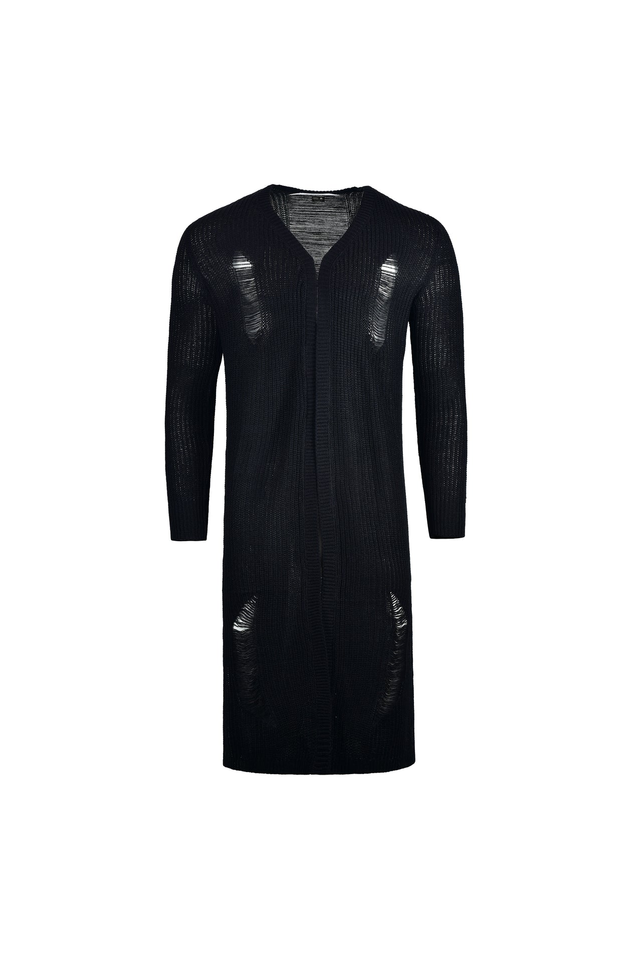 Long black knit cardigan in mesh fabric, featuring subtle transparency and strategically distressed areas that add visual depth and character. Its open design and extended length elongate the silhouette, making it an ideal piece for layering and artistic, attitude-driven looks.